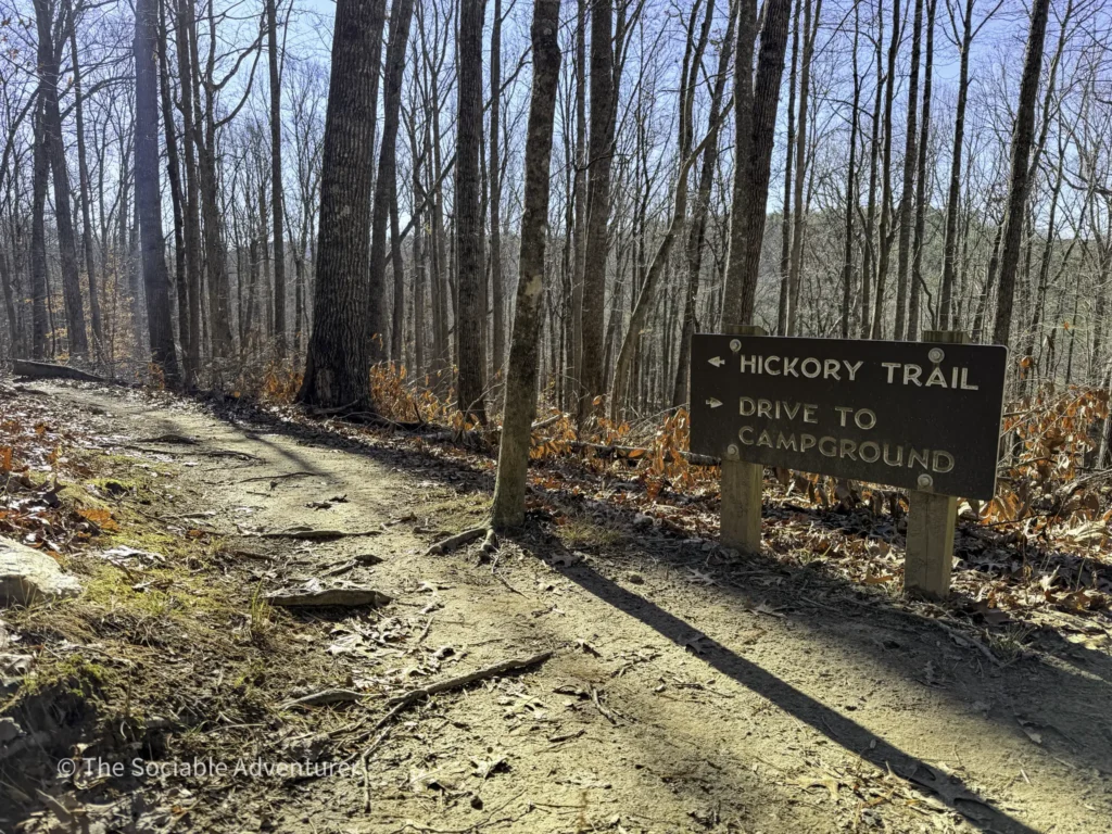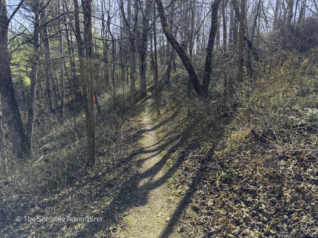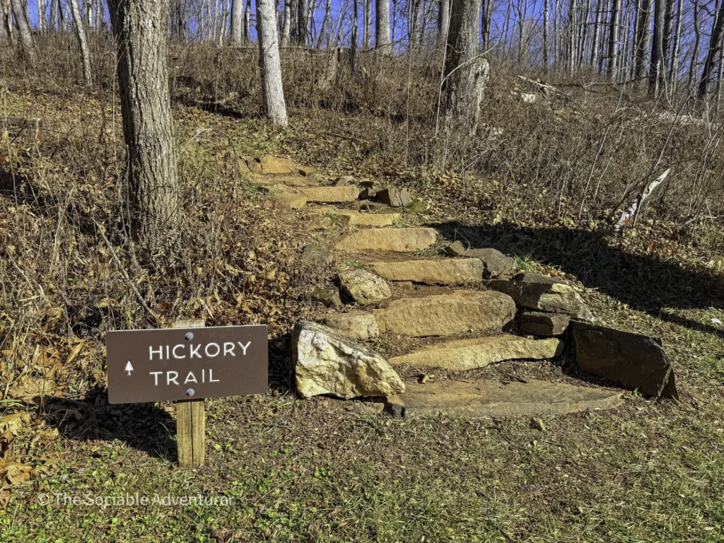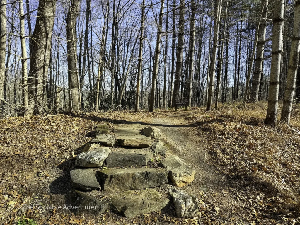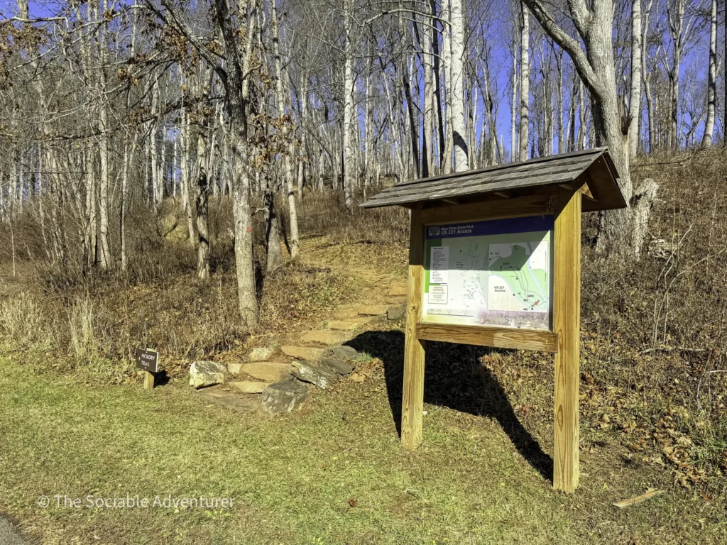 The Hickory Trail at the US 221 Access in New River State Park is a red-blazed loop trail about 1 to 1.2 miles long, rated easy to moderate. It starts near the visitor center and parking area, winding through a hardwood forest filled with oaks and hickories. Along the way, you’ll find open views, shelf fungi on trees, and a peaceful setting.