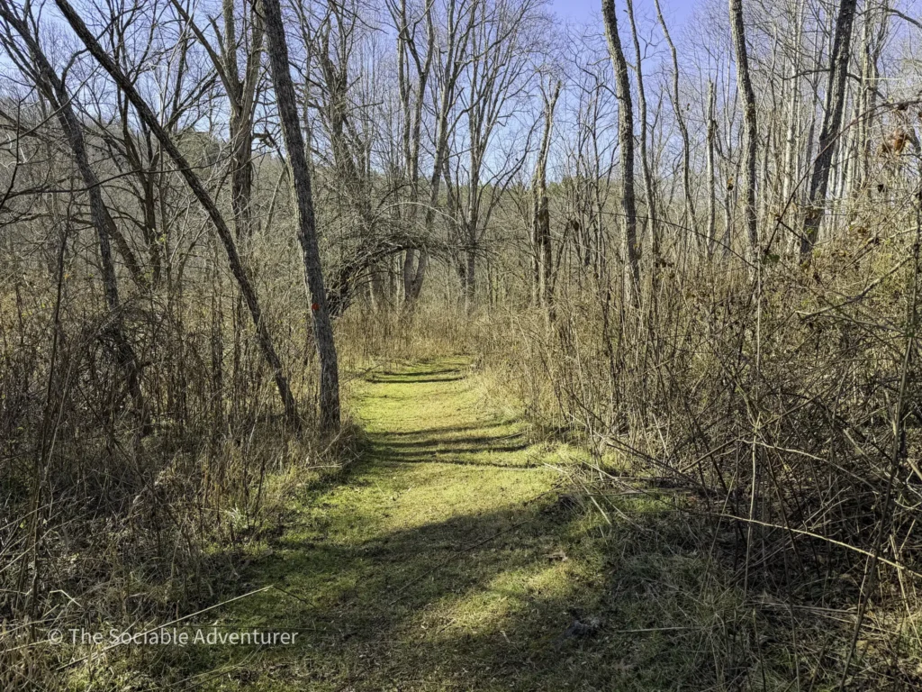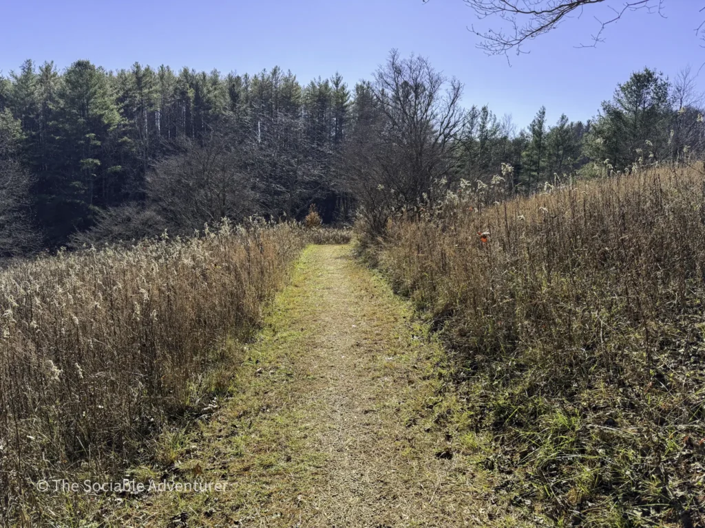 The trail’s main loop forms the core of the hike, with two out-and-back sections at either end, similar to short spurs branching off the loop. One segment climbs gently uphill from the parking lot through fields and forest before joining the loop, while another heads toward the river or connects with nearby trails, such as at a T-junction where the loop continues and a side path like River Run branches off.