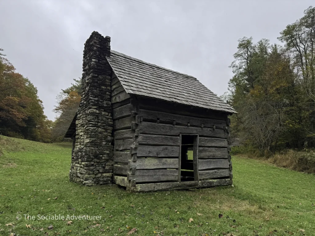 A short, flat walk of about 0.1 miles from the parking area takes you to a sunny meadow. Here, you’ll find a restored log cabin from before 1840, once owned by Jesse Brown, and the old Cool Springs Baptist Church. These buildings stand as reminders of pioneer life. In spring, mountain laurels bloom, and in autumn, the nearby trees show off beautiful colors, even though you can’t see distant mountains.