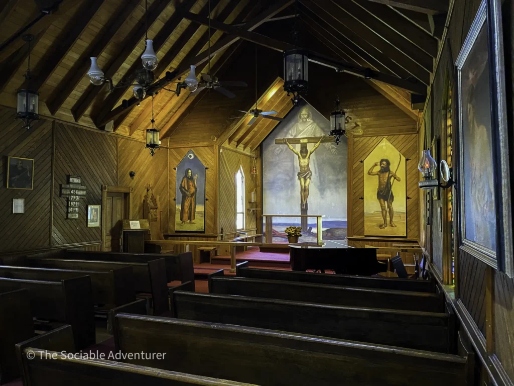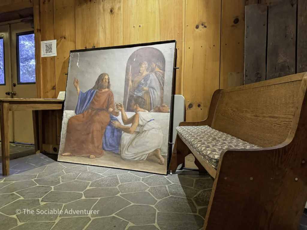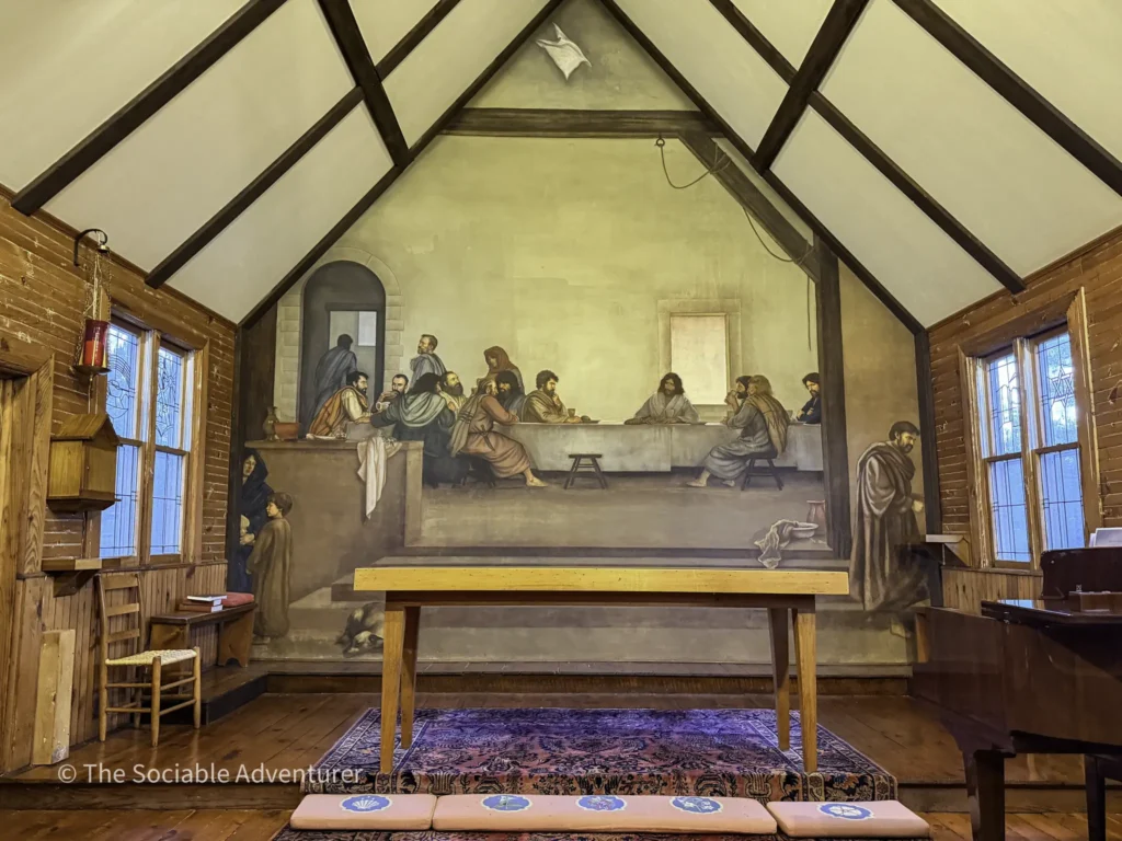 The Last Supper: The sanctuary is dominated by Benjamin F. Long IV’s The Last Supper, a massive work that reimagines the biblical scene through the lens of the North Carolina High Country. Long, who studied under masters in Italy, chose to ground this divine moment in local reality by using residents of Ashe County as models for the Apostles. The composition is physically immersive, spanning the entire wall behind the altar and featuring a self-portrait of Long as St. Thomas. The faces carry the weathered, stoic expressions of Appalachian life, bridging the gap between sacred history and the community that restored the church from a state of ruin in the late 1970s.