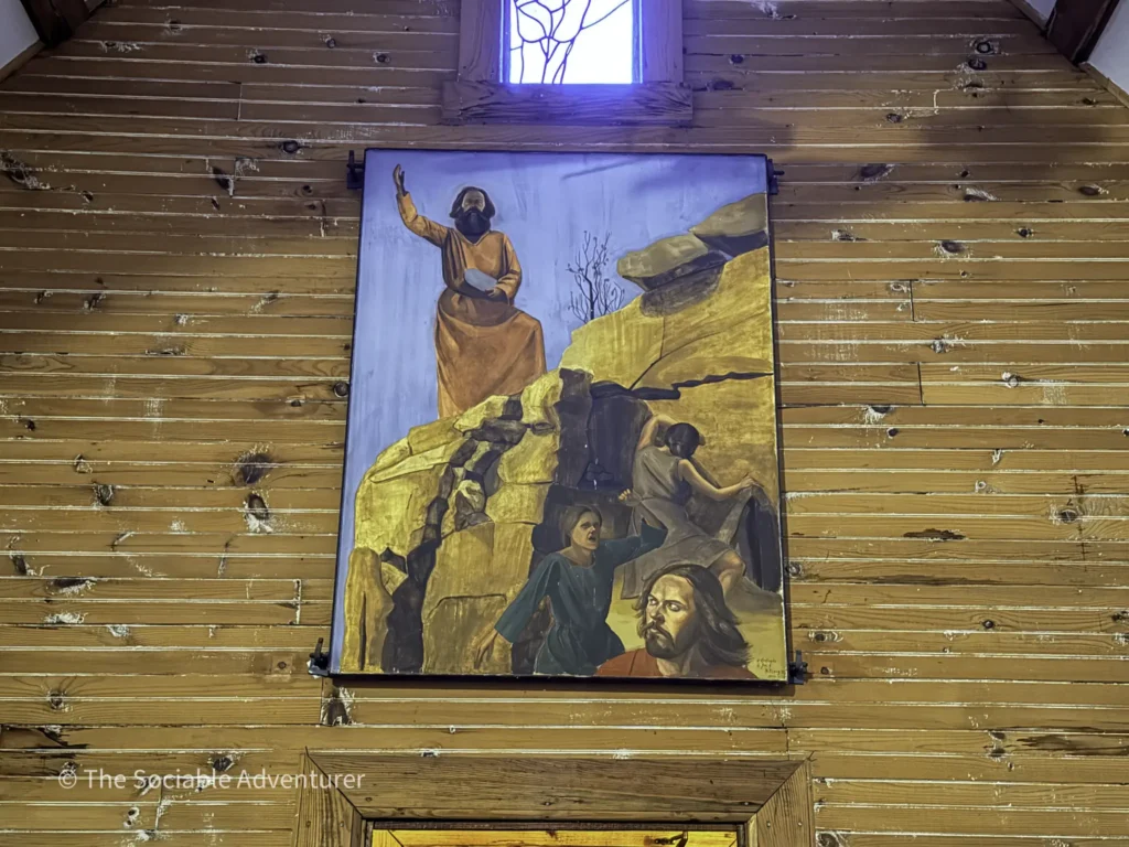 John the Baptist: Located on the opposite wall, this fresco presents a sharp contrast to the serene Mary. Long depicts John the Baptist as a rugged, visceral figure—a “voice crying out in the wilderness.” With weathered skin, tangled hair, and a piercing, almost haunting gaze, this John is the fiery prophet of the Jordan River. He is shown holding a staff, symbolizing his role as a precursor to Jesus, with the background of the Blue Ridge landscape subtly integrated into the biblical scene. The intensity of his expression is meant to evoke the urgency of his call to repentance. An enduring and unique detail of this specific fresco is a small bumblebee that flew into the church while Ben Long was working; it became trapped in the wet lime plaster and remains embedded within the artwork to this day.