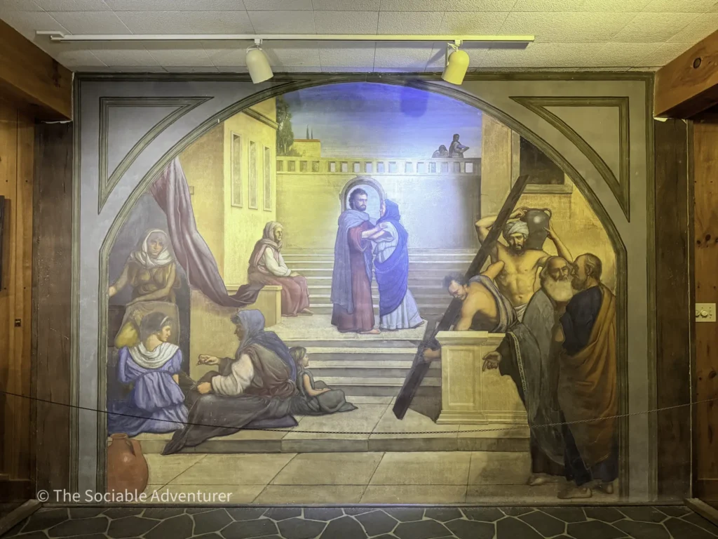 Mary Magdalene Washing Jesus’ Feet: Also found in the lower-level chapel area is the student fresco depicting Mary Magdalene washing the Feet of Jesus. This work was created by one of Benjamin Long’s students during the original 1980 project, serving as both a piece of sacred art and a testament to the church’s role as a training ground for the fresco revival. The scene captures the moment of humble devotion where Mary Magdalene anoints Jesus’ feet with oil and dries them with her hair. Its presence in the lower level underscores the church’s dedication to themes of servanthood and humility, providing a quiet space for visitors to reflect on the smaller, personal acts of faith.